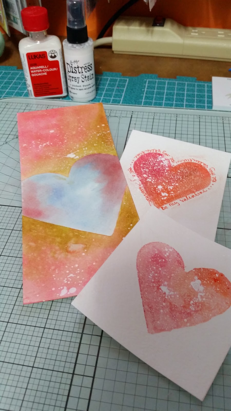 I have a TON (seriously, it's a sickness) of stuff to use for coloring, and, it was high time I started to play with something OTHER than actual water colors. For these samples, I picked Faber Castel Gelatos for the smaller hearts and I used Ranger Distress Ink for the larger piece. All three enjoyed a spray of Picket Fence Distress paint to splatter white at the end. You could splatter with bleach water too, but I hate the smell and am I'm tired of white spots on my clothes.